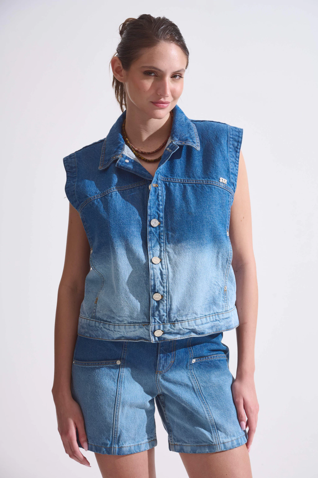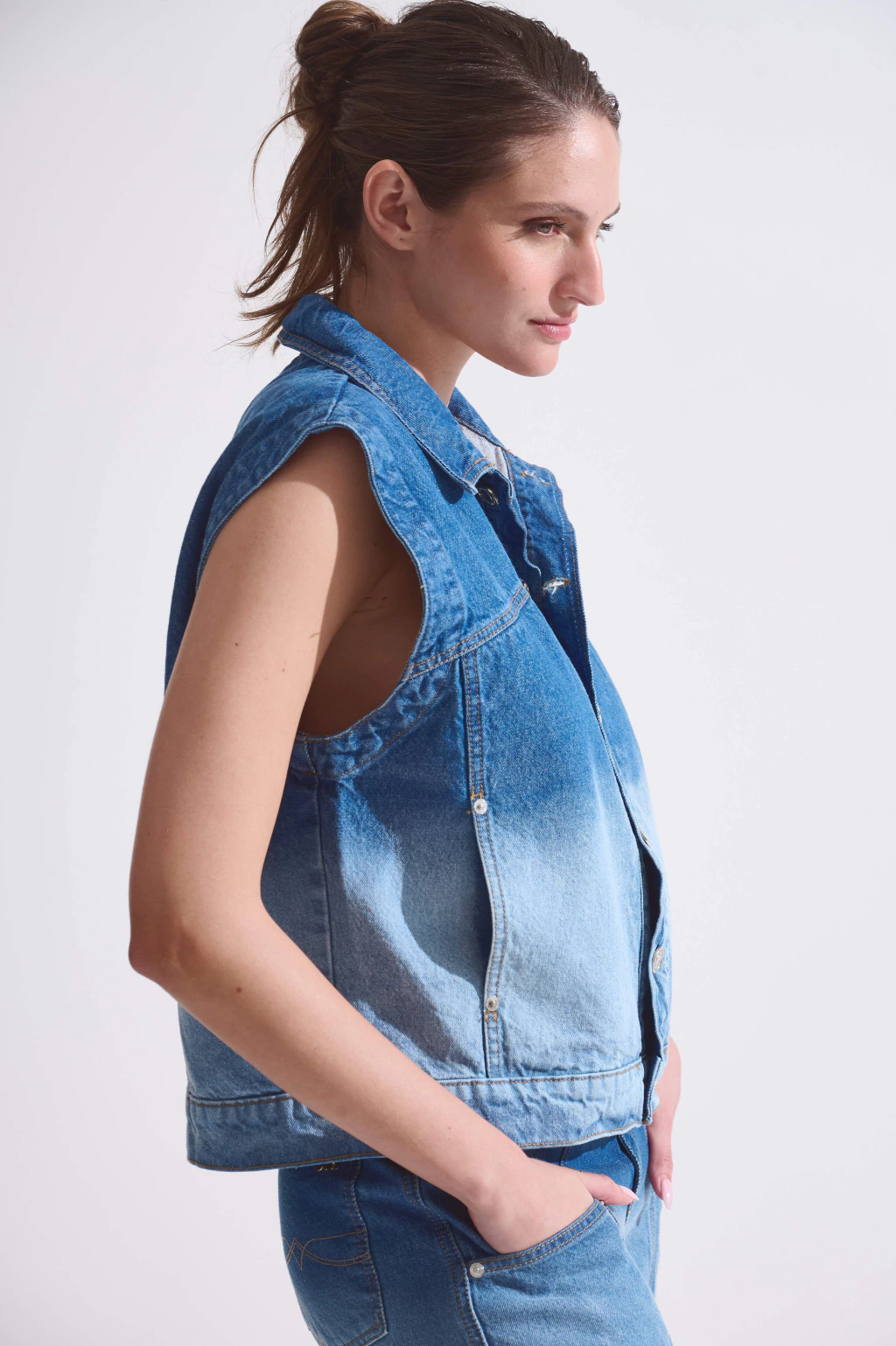 Chaleco de denim azul con degradé en blanco. Un pedazo de mar en una prenda única.