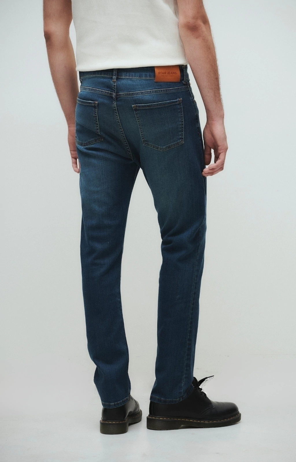Jeans tiro medio, calce regular, lavado stone wash azul.