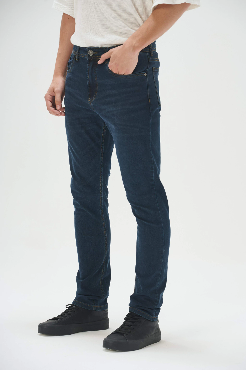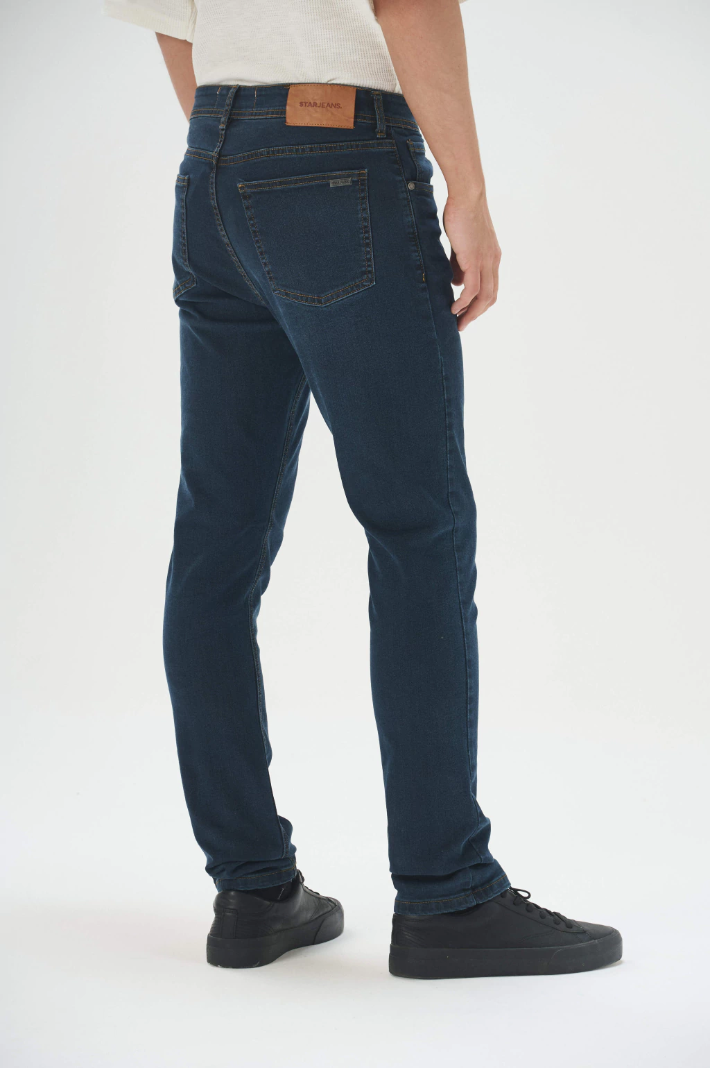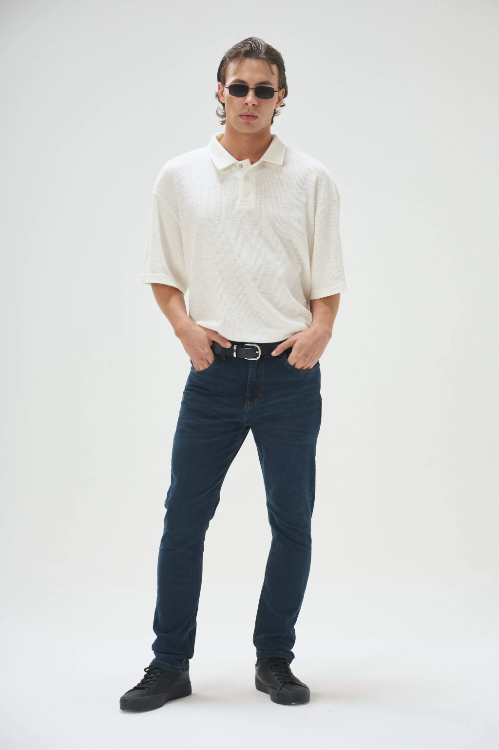 Jeans tiro medio, calce regular, suavizado con localizado suave y bigotes.
